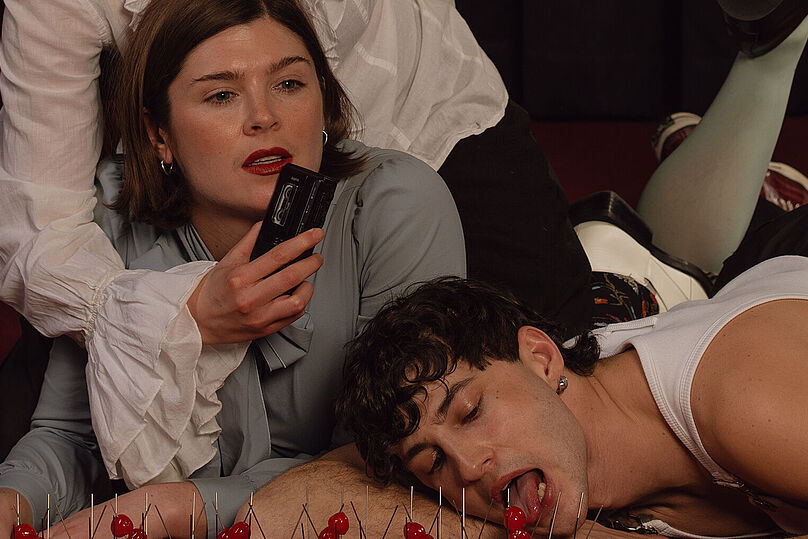 In a surreal waiting room, three performers probe dictation as a bodily and sonic force—circling its power structures while searching for moments of deviation.