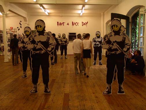 Banksy's pieces want to reach the effect of popsongs in terms of their impact and creation of identification. The aim is therefore to circulate the images and texts as much as possible, in books, magazines, in exhibitions, but first and foremost in town and country. Banksy has had exhibitions in London, Hamburg, and Los Angeles, amongst others. He publishes his own series of books, so far "Banging your Head against a Brick Wall" (2001), and "Existencilism" (2002) and was e. g. also represented in "Stencil Graffiti" (Tristan Manco, Thames & Hudson, London 2002).