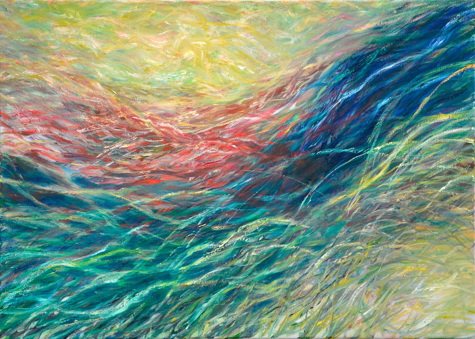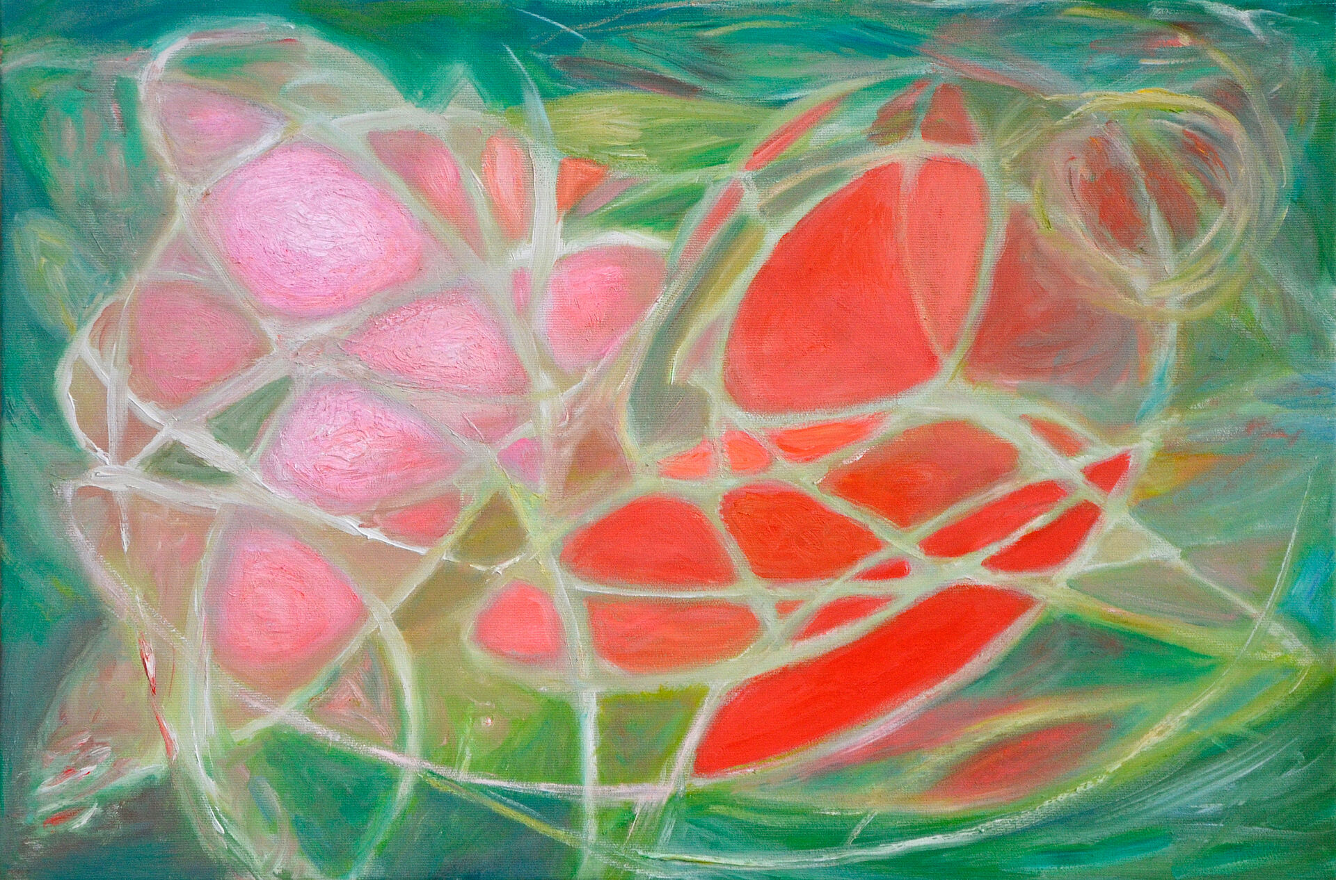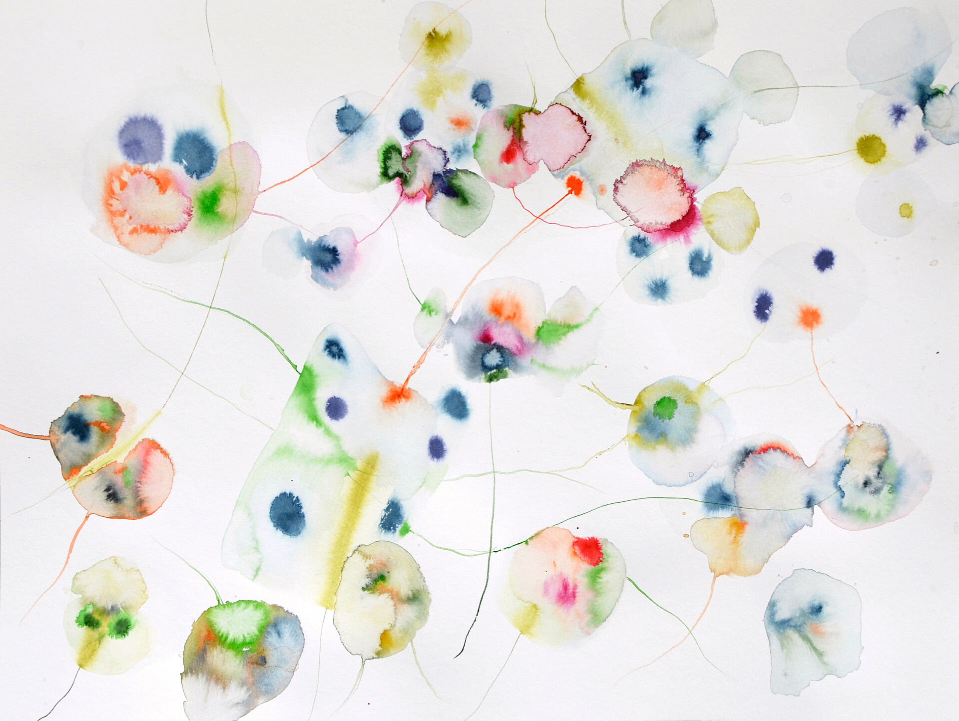In ihren Papierarbeiten mit farbigen Tuschen legt die Künstlerin ihre Aufmerksamkeit auf Lebendigkeit des Strichs, Entfaltung der Farben und Einfangen von Licht. Sie setzt Bildelemente in dynamisch ausbalancierte Beziehungen zueinander, die Bewegung suggerieren. So entstehen imaginäre Räume für Transformation. Die Künstlerin bringt Prozesse in Gang, bei denen Strukturen und Elemente entstehen, die an Urformen des Lebens erinnern.