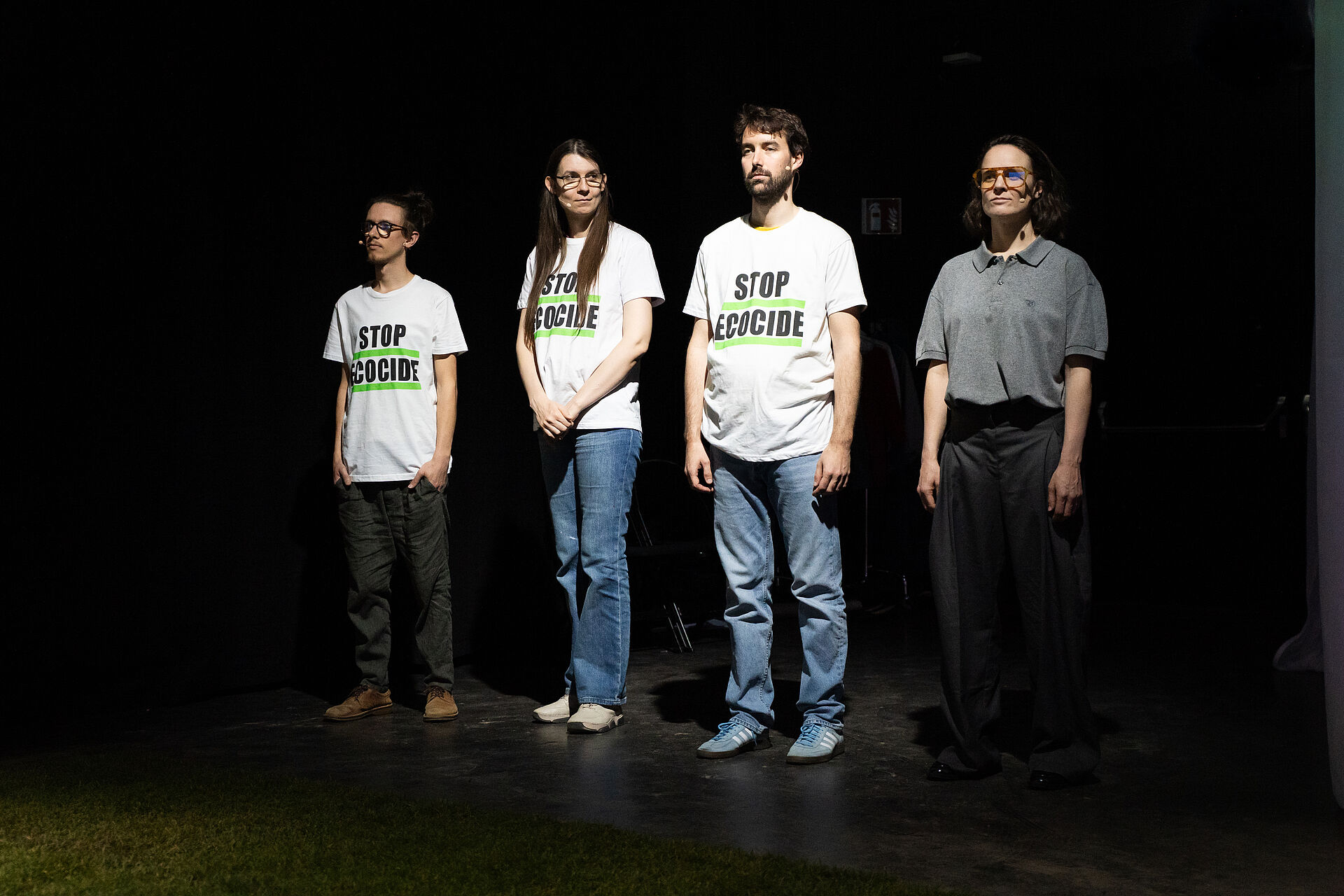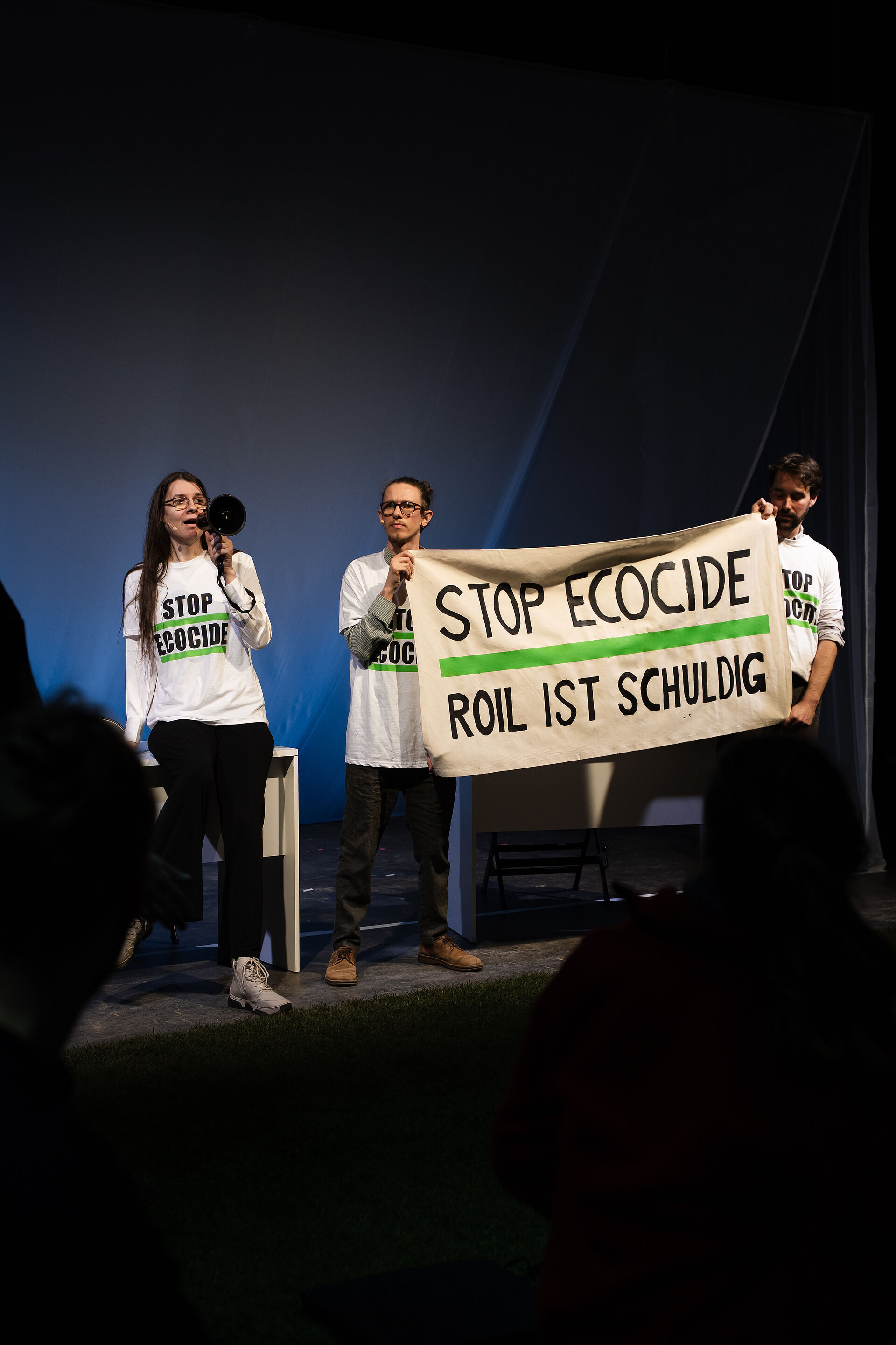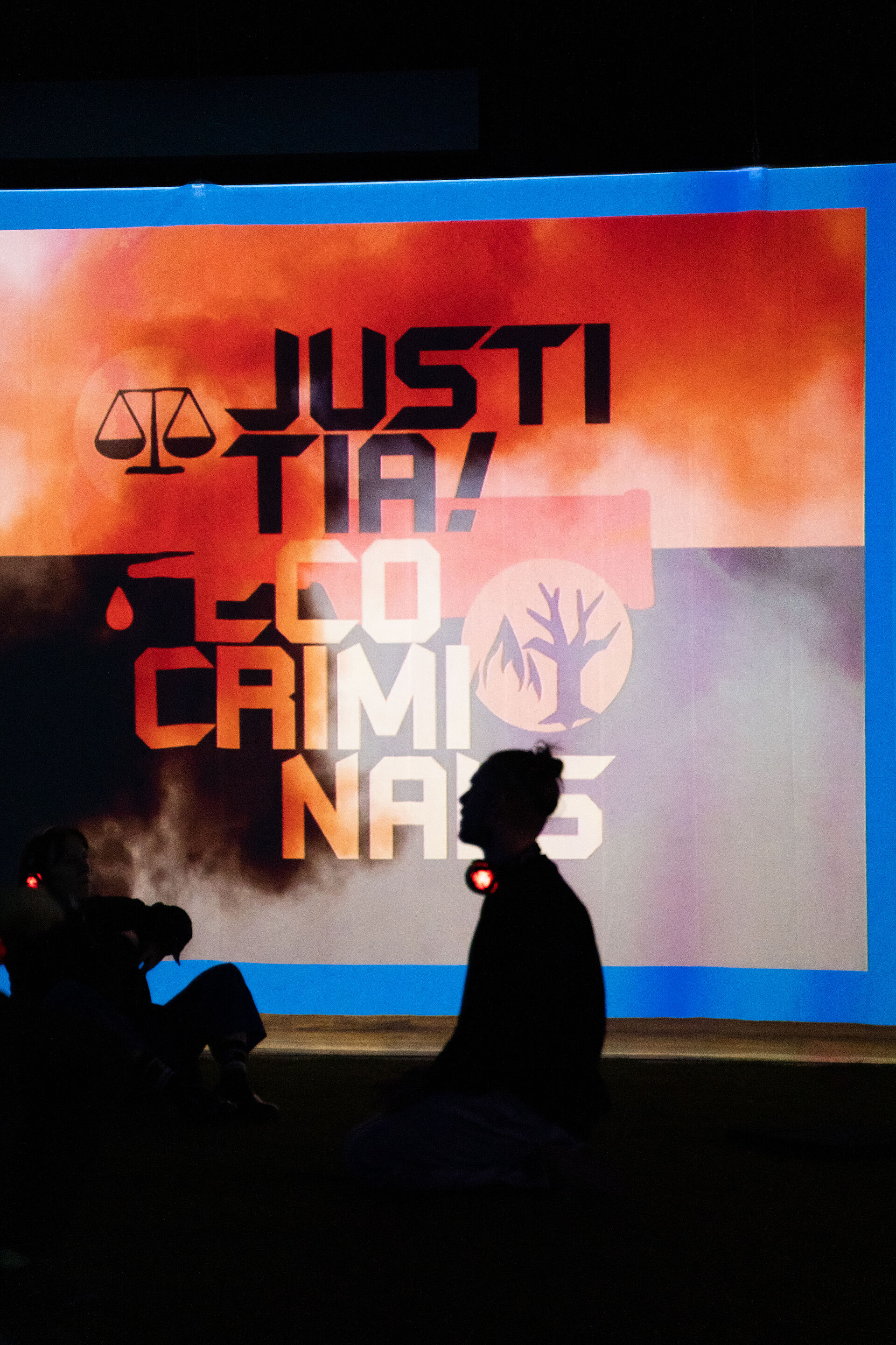 Zeitgleich zur 30. Weltklimakonferenz in Brasilien bietet die installative Performance „JUSTITIA! Eco Criminals“ Einblicke in zwei Seiten eines hochaktuellen Konflikts und lässt das Publikum selbst wählen, welcher Perspektive des Geschehens es folgt: dem Weg der Aktivist*innen vor Gericht oder der Sicht der Konzerne. Der Abend entfaltet zwei parallele Szenarien, die beide in eine juristische Auseinandersetzung in einem zukünftigen Ökozid-Prozess münden.