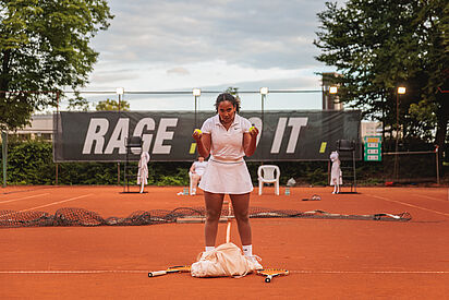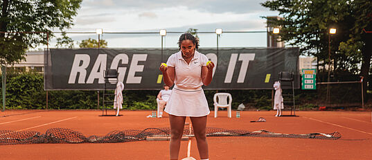 RAGE fahndet nach den verschiedenen Lesarten von Wut und untersucht Gründe ihrer Ungleichverteilung. Untersuchungsfeld ist der Tenniscourt als Schauplatz, in dem Einschreibungen von race und Gender verhandelt werden.