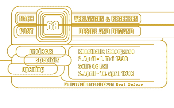NACH 68 VERLANGEN & BEGEHREN ist ein Ausstellungsprojekt mit internationalen, jungen - nach Mai 68 geborenen - KünstlerInnen. Ausgangspunkt sind die Ereignisse des Jahres 68, deren Umfeld sowie Ideen, Utopien, Gegenkulturen und alternative Lebensentwürfe der damaligen Zeit.