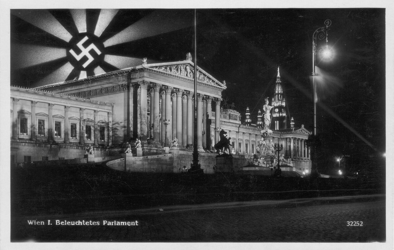 Auch die nach dem „Anschluss“ im März 1938 an die Macht gekommene nationalsozialistische Stadtregierung setzte massiv auf die propagandistische Kraft des Lichts. Zwar gab es in Wien keine Großinszenierungen wie in Berlin oder Nürnberg, wo gewaltige „Lichtdome“ in den Himmel projiziert wurden, ausgeklügelte Lichtdramaturgien fehlten aber keineswegs. Vor allem die Volksabstimmung am 10. April 1938, die wohl größte Propagandaschlacht in Österreich im 20. Jahrhundert, später auch der 1. Mai sowie Hitlers Geburtstag boten Anlass für spezielle Lichtevents. Gebäude wurden mit Lichtbändern geschmückt, zum Teil auch mit überdimensionalen Hakenkreuzen und der in die Nacht schreienden Parole „Ein Volk Ein Reich Ein Führer“. Und man verteilte Propagandakarten, die das Hakenkreuz in Form einer aufgehenden Sonne vor bekannten Wiener Sehenswürdigkeiten zeigten, die damit in „neuem Licht“ erstrahlten.