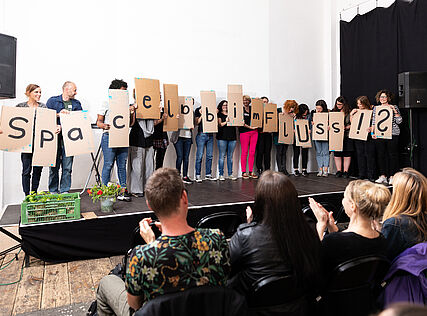 Schließlich präsentierten sich alle WUK Bildungs- und Beratungsprojekte einzeln unter dem Motto „Was uns seit dem letzten Mitarbeiter_innen-Tag besonders gut gelungen ist.“ Die überaus kreativ vorbereiteten Darbietungen beinhalteten alles von Plakaten, Schildern, Wollknäuel und Luftballonen über Zitate von Kursteilnehmer_innen bis zu erstaunlich komplexen Performances und gesundheitsfördernden Turnübungen. Für die Arbeitsatmosphäre in den einzelnen Projekten spricht, dass wiederholt das gute Team hervorgehoben wurde.
