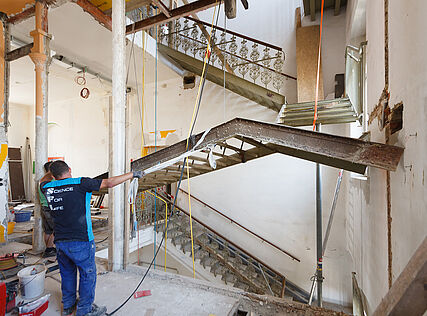 Zug um Zug: Die umfangreiche Sanierung dauert bis 2024 und wird auf 12.000 m² im Uhrzeigersinn, Trakt für Trakt und Stockwerk für Stockwerk durchgeführt. Im Vordergrund stehen dabei Maßnahmen, die das Gebäude zukunftsfit machen. Besonders wichtig sind uns Barrierefreiheit und die Ökologisierung des Gebäudes – das Haus bekommt zwei Aufzüge und barrierefreie WCs, Gründächer und eine Photovoltaikanlage.