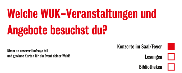 Hallo {PER_VORNAME[std:Musikfreund_in]}! Der Frühling steht vor der Tür und eine mittlerweile liebgewonnene Tradition ist der jährliche Vorbote im WUK: Che Sudaka bringen am 9.3. ihre energiegeladene Mischung aus Ska, Punk und Latin-Sound unter dem Tournamen “Wir sind Licht” auf die Bühne. Mit dem akustisch barrierefreien Konzertabend „Beat the Silence“ verabschieden wir am 27.2. den Februar und starten direkt am Sonntag (1.3.) in den März mit Alfa Mist, dessen Album „Roulette“ einen Blick in eine dystopische Zukunft wirft. Betterov erzählt am 5.3. mit „Große Kunst“ persönliche (Familien-)Geschichten zwischen Indie, Pop und melancholischem Songwriting. Am 13.3. präsentieren außerdem FJØRT aus Aachen im Rahmen ihrer “BÉ FJØRT”-Tour ihren intensiven Post-Hardcore-Sound. Let's talk about WUK, baby! Bis 22.3. läuft die WUK-Publikumsbefragung! Du bist gefragt uns deine Meinung zum WUK zu sagen und mit etwas Glück Freikarten, Workshops oder Köstlichkeiten von WUK bio.pflanzen zu gewinnen. Also mach mit und sag' uns was du denkst! Wir freuen uns schon auf deinen Besuch! Bis bald im WUK! Facebook | Instagram | Spotify | TikTok | |