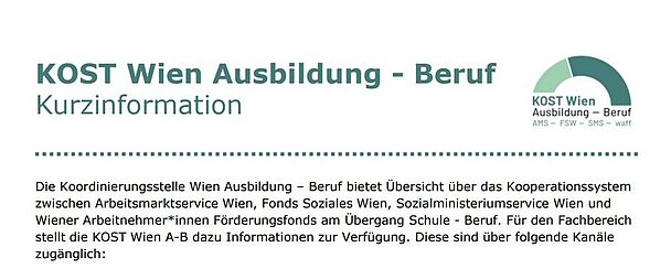 |  KURZINFORMATION KOST WIEN AUSBILDUNG - BERUFIm Zuge der Ausweitung der Informationsmaterialien und nach Rückmeldung aus dem Fachbereich stellt die Koordinierungsstelle Wien Ausbildung – Beruf (KOST A-B) seit Kurzem die Kurzinformation KOST Wien Ausbildung – Beruf (im PDF-Format) zur Verfügung. In kompakter Form werden auf einer Seite jene Angebote der KOST A-B abgebildet, die für die Mitarbeiter*innen des Fachbereichs in der täglichen Arbeit relevant sind. Insbesondere bei der Einarbeitung neuer Mitarbeiter*innen soll die Kurzinformation dabei unterstützen, - die Webseite der KOST A-B als Informationsquelle abzubilden,