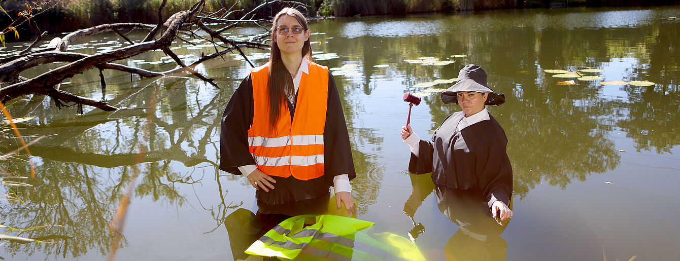 Zeitgleich zur 30. Weltklimakonferenz in Brasilien bietet die installative Performance „JUSTITIA! Eco Criminals“ Einblicke in zwei Seiten eines hochaktuellen Konflikts und lässt das Publikum selbst wählen, welcher Perspektive des Geschehens es folgt: dem Weg der Aktivist*innen vor Gericht oder der Sicht der Konzerne. Der Abend entfaltet zwei parallele Szenarien, die beide in eine juristische Auseinandersetzung in einem zukünftigen Ökozid-Prozess münden.