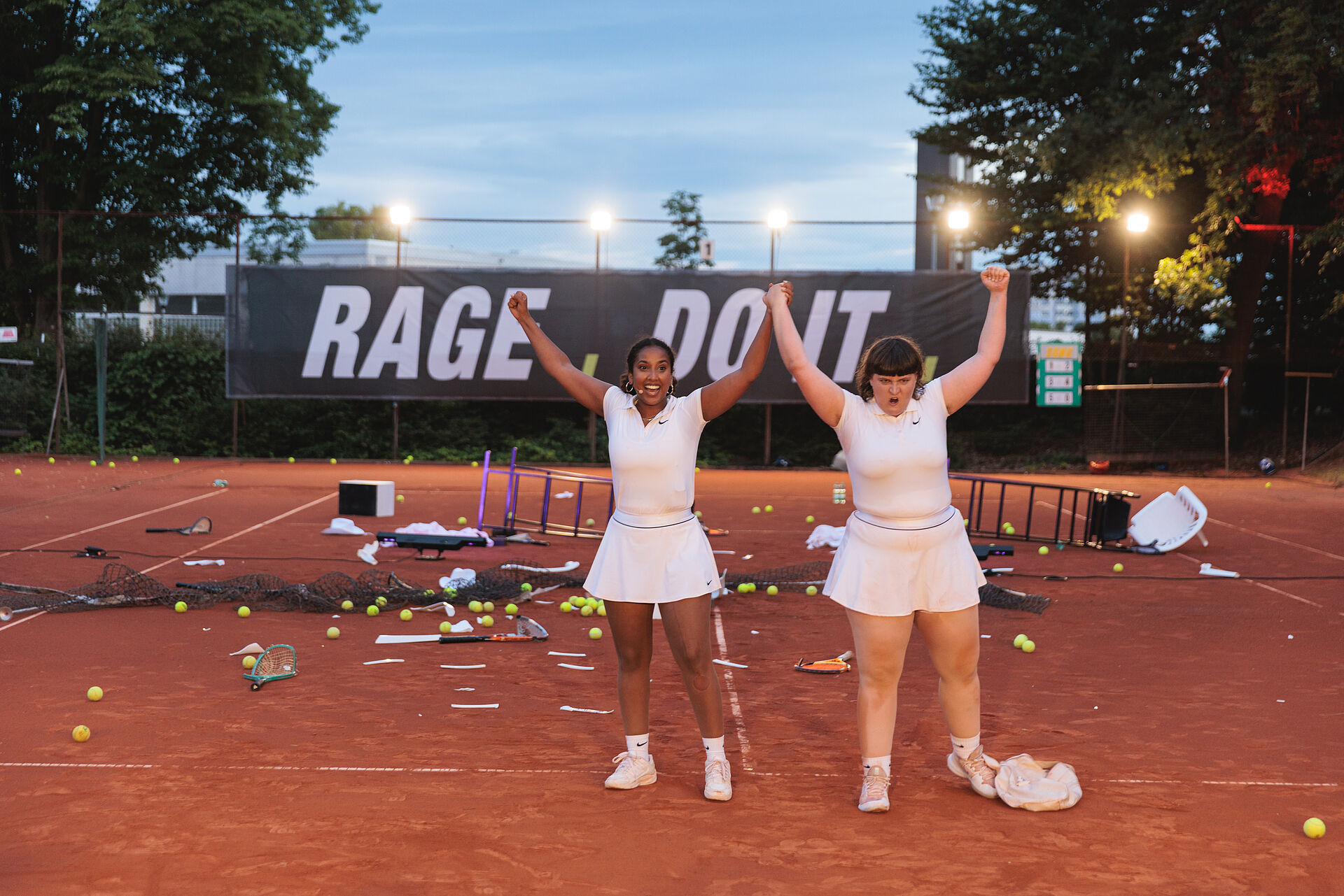 Zwei Tennisspielerinnen rasten aus. Zerschmettern Schläger. Reißen Netze ein. Verlieren endlich die Kontrolle. Das Spielfeld liegt in Trümmern. Dünner Sand weht über das Feld. Auftritt zweier Cowboys. Als Country Fans, Tennisgöttinnen und zugleich höchst erregbare Big Bosses wagen Iman Tekle und Maria Sendlhofer einen Balanceakt auf der Linie zwischen Reenactment und Empowerment, zwischen Solidarität, Sportmanship und entfesselter Wut. RAGE fahndet nach den verschiedenen Lesarten von Wut und untersucht Gründe ihrer Ungleichverteilung. RAGE rückt die Inszenierung von Wut ins Zentrum des Geschehens: als Fake, als Annahme, als Privileg, als Übertreibung und als fulminantes Spiel.