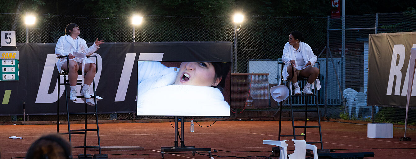 Wir experimentieren mit TENNIS als Mechanismus der Erregbarkeit, in dem es nur darum geht, die Gegenspielerin aus der Form laufen zu lassen. Der Tenniscourt interessiert uns als hypersymbolischer Ort, der durchzogen ist von Systemen von Macht und Kontrolle: Wer darf sich wie verhalten? Wem glauben wir? Die Regeln des Spiels, angeblich für alle gleich, werden je nach Person, die sich auflehnt, ganz unterschiedlich bewertet. Im Tennis gibt es dafür unzählige Beispiele, man vergleiche nur den Wutausbruch eines John McEnroe (dessen Schimpftiraden wir in edle Countrysongs verwandelt haben) mit der Aufbegehr einer Serena Williams, und siehe da, wie lange der white Dude ununterbrochen wüten darf, während bei der zornigen Schwarzen Frau jahrtausendealte Stereotype schnellstmöglich wieder reaktiviert werden… WESTERN beschäftigt uns als Genre, in dem Rival*innenschaft und Polarisierung überdeutlich zu Tage treten und gefährlich werden. Eine Verquickung der beiden Genres Tennis und Western ermöglicht der Performance, Achsen weißer Privilegiertheit und Kontrolle sichtbar werden zu lassen und durch Überkonkretisierung ad absurdum zu führen, sie aber auch lustvoll zu überschreiben und neu anzueignen.