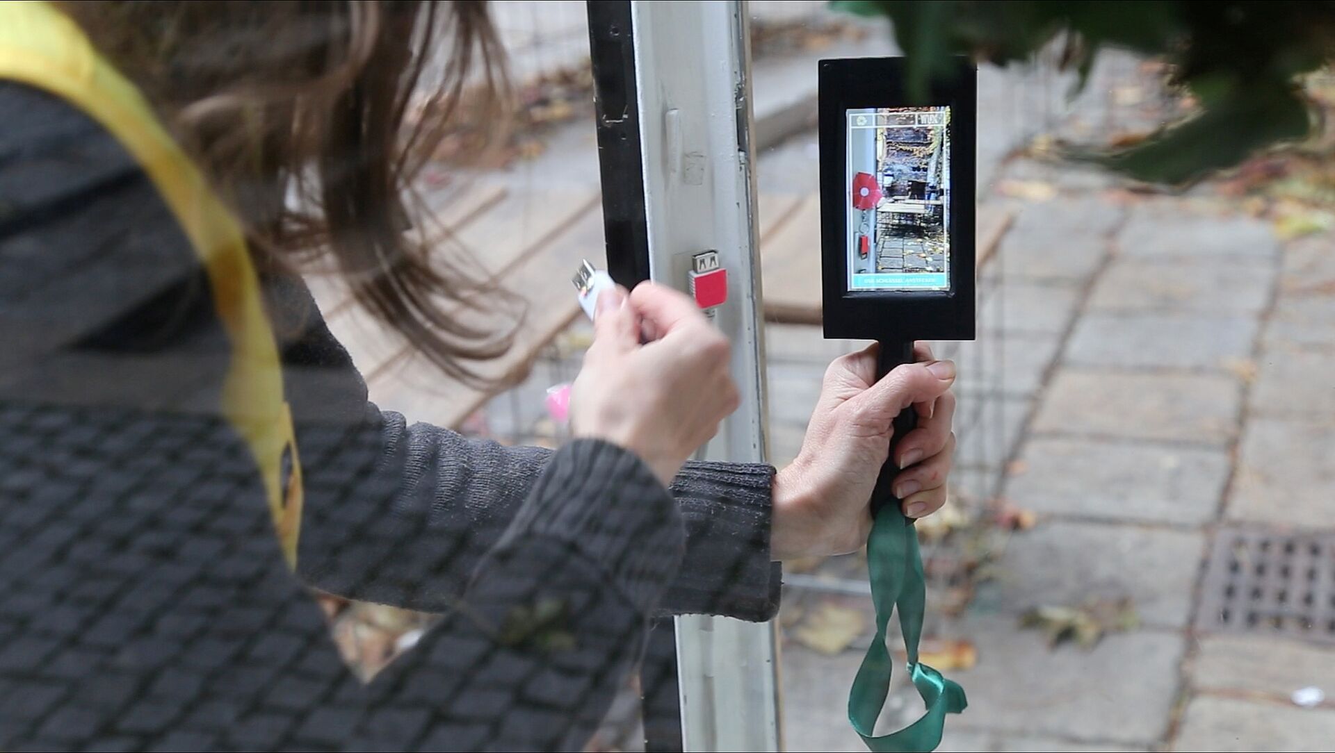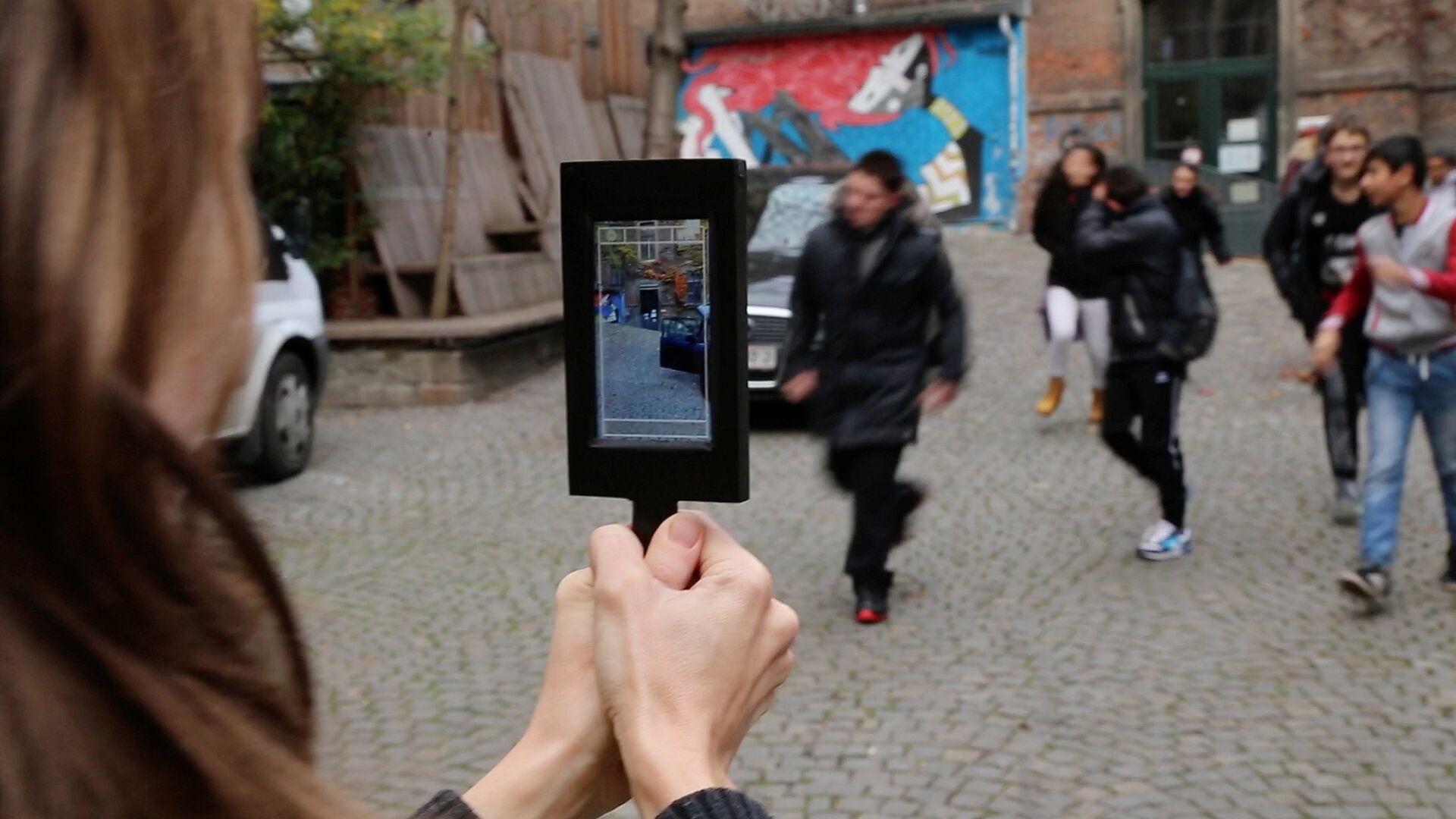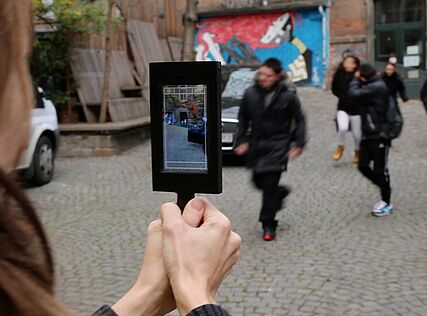 Person hält Tablet mit sichtbarem Bild von sich selbst, im Hintergrund mehrere Personen auf gepflastertem Platz
